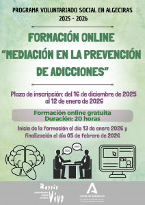El próximo 13 de enero de 2026 dará comienzo la FORMACIÓN ONLINE: “MEDIACIÓN EN LA PREVENCIÓN DE ADICCIONES” diseñada para dotar a personas voluntarias y
