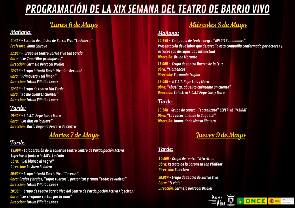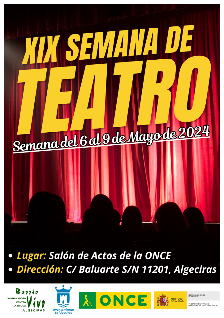 Hoy lunes 6 de mayo, Barrio Vivo dar谩 inicio a su XIX Semana de Teatro. Estamos emocionados/as de traerles una vez m谩s una selecci贸n de obras que prometen cautivar, emocionar y hacer reflexionar a todos los espectadores/as. 隆No se lo pueden perder! Invitamos a cada uno de ustedes a unirse a nosotros/as y disfrutar de esta celebraci贸n del arte esc茅nico. Tendr谩 Lugar en la Fundaci贸n ONCE. Os adjuntamos la programaci贸n y cartel. Esta actividad pertenece al Programa Algeciras Ocio y Tiempo Libre Inteligente 2023/2024 subvencionado por el Ayuntamiento de Algeciras y el Plan Nacional Sobre Drogas.