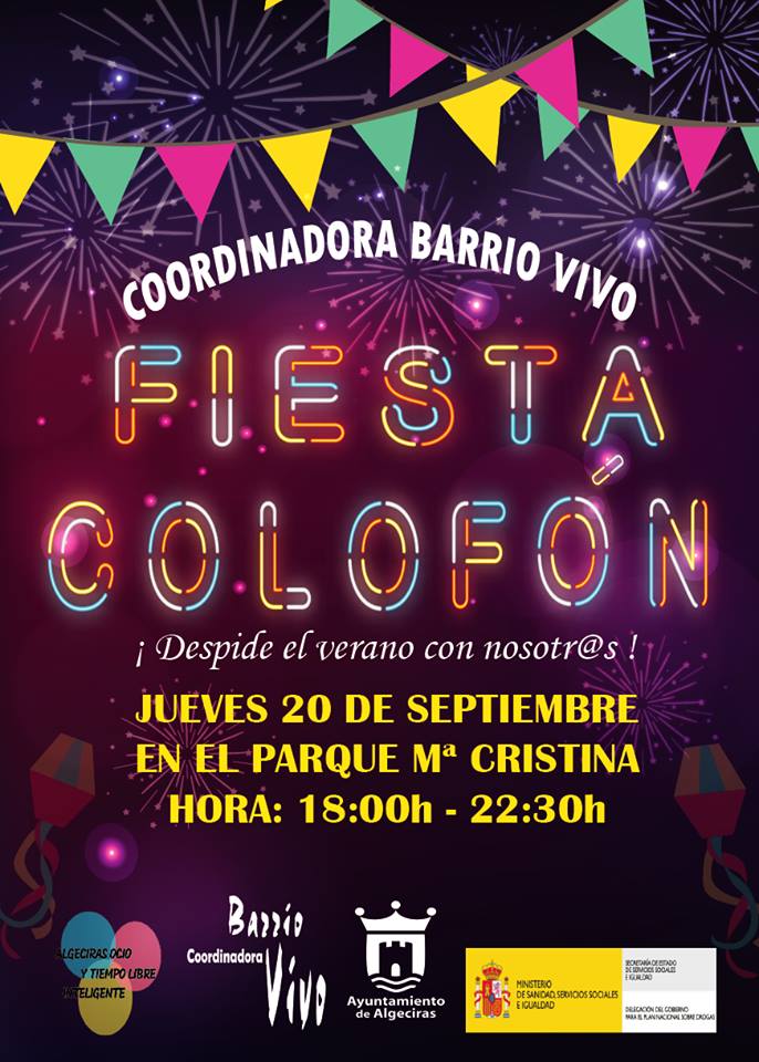 FIESTA COLOFÓN 2018.Nueva entrada / Por Administrador Os esperamos este jueves 20 de septiembre a partir de las 18:00h en el Parque María Cristina para despedirnos del verano por todo lo alto con la Gran Fiesta Colofón!!! !!! PARTICIPA !!!