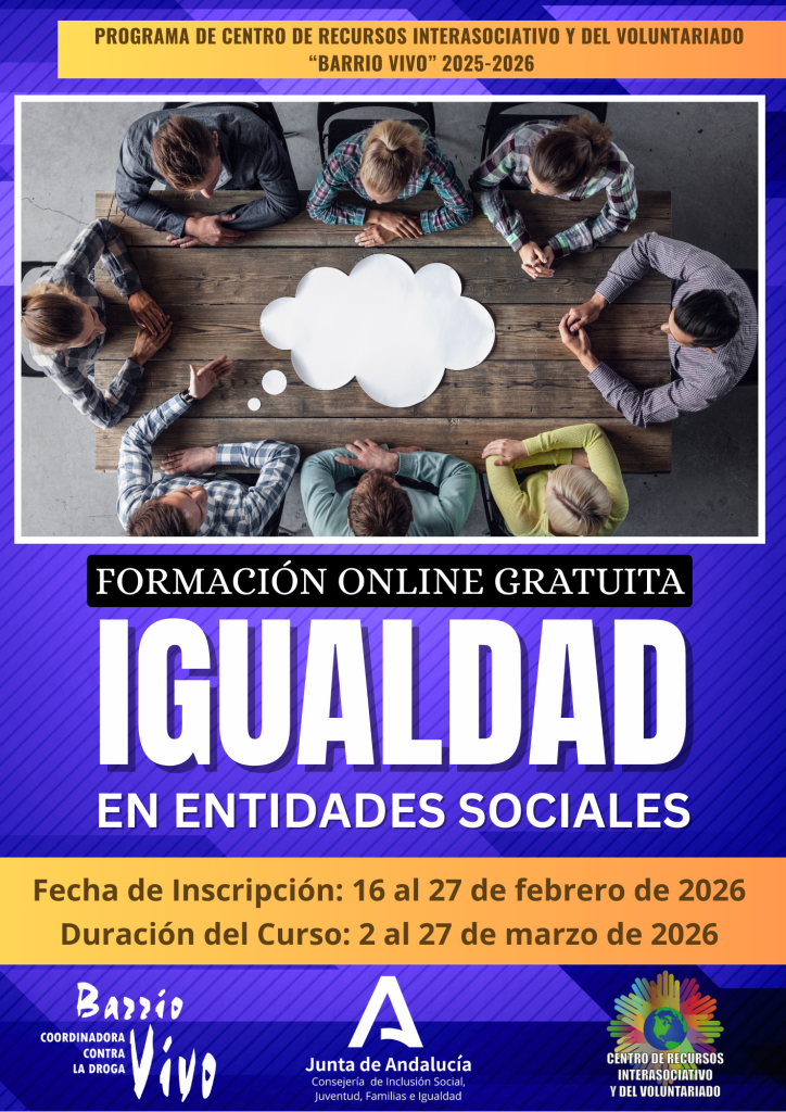 Esta formación pertenece al Programa “Centro de Recursos Interasociativo y del Voluntariado Barrio Vivo” 2025/2026 subvencionado por la Consejería Inclusión Social, Juventud, Familias e Igualdad de la Junta de Andalucía.