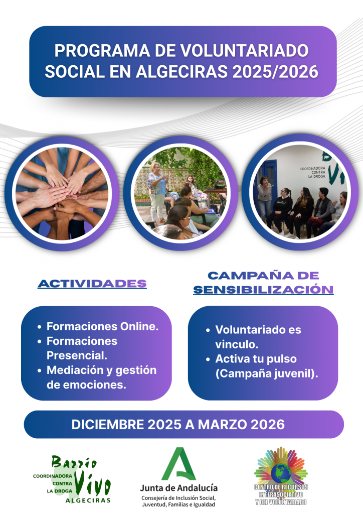 Desde nuestra entidad trabajamos para canalizar y fortalecer la participación voluntaria. Es por ello que se pone en marcha el Programa Voluntariado Social en Algeciras 2025/2026, el cual se ejecuta desde el 15 de diciembre 2025 al 31 de marzo 2026, subvencionado por la Consejería de Inclusión Social, Juventud, Familias e Igualdad de la Junta de Andalucía, con el objetivo de promover la acción voluntaria mediante el desarrollo de iniciativas orientadas a la formación, el intercambio de experiencias y la puesta en valor del voluntariado como herramienta de participación y transformación social,ofreciendo las siguientes actuaciones: